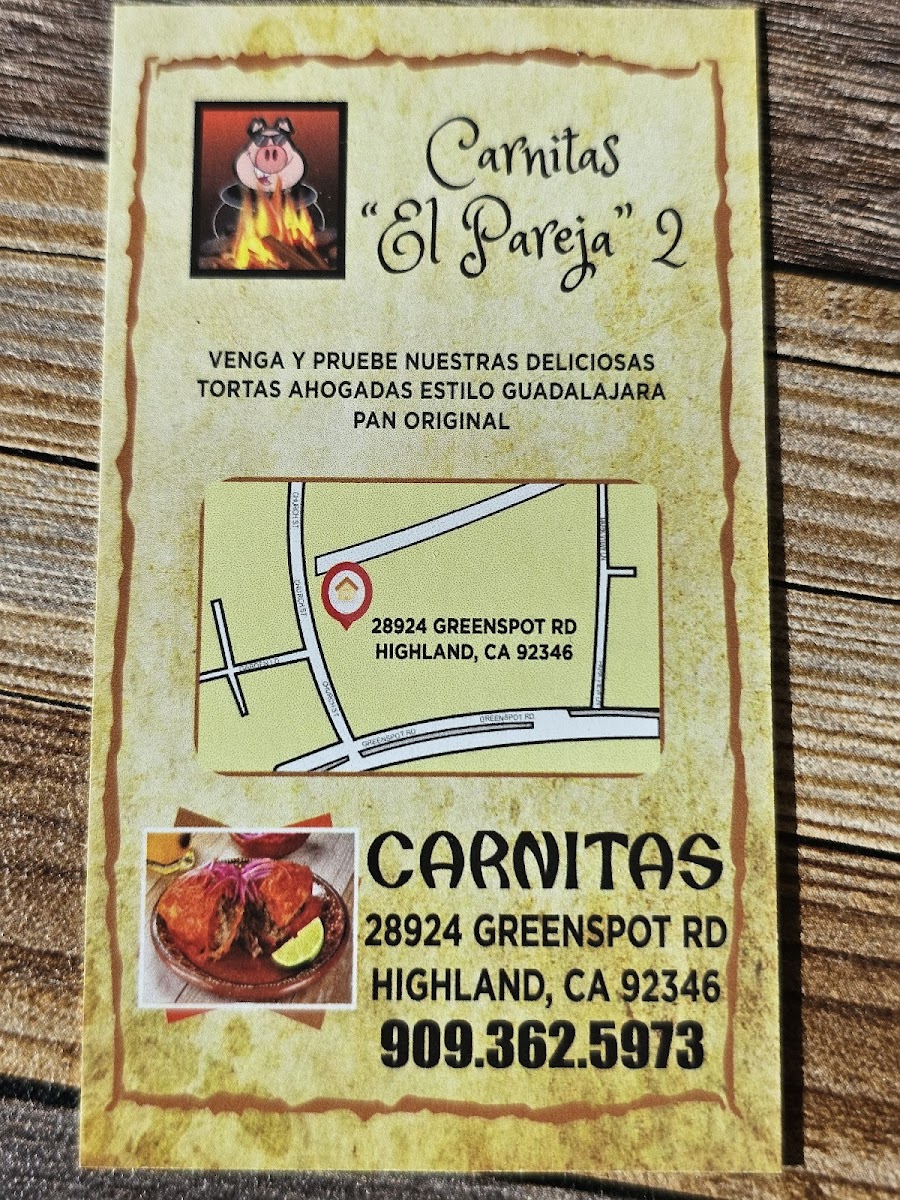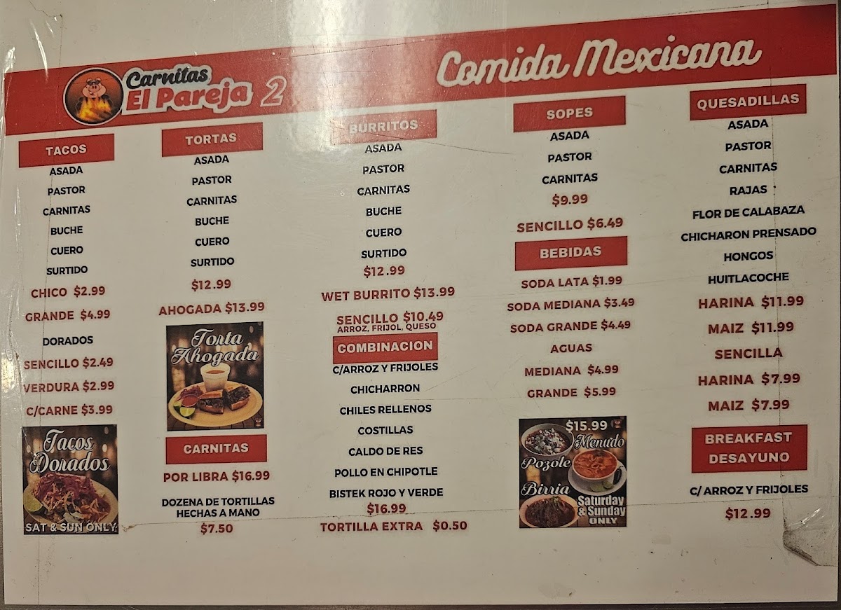 The menu at Carnitas El Pareja 2 offers a straightforward and comforting selection of traditional Mexican dishes, perfect for casual meals any time of day. Whether you’re stopping by for a hearty breakfast burrito or settling in for a flavorful dinner with dishes like chicken wet burritos and flautas de pollo, the menu delivers familiar, satisfying flavors.